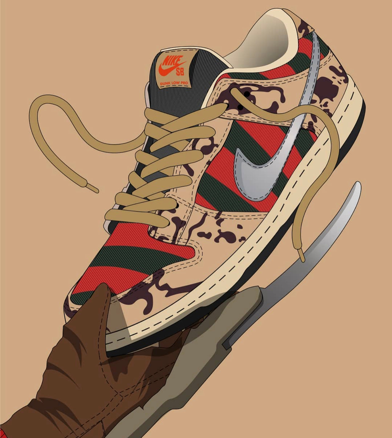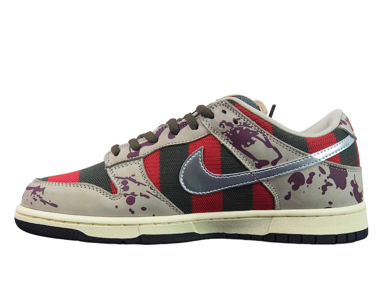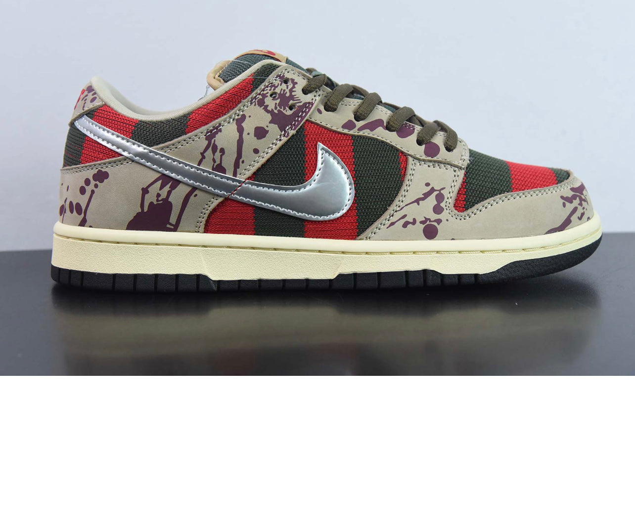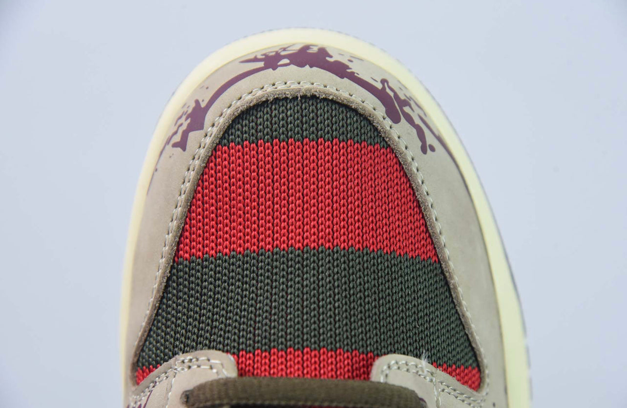 .Nike Dunk Lo custom Sneakers made with premium leather and features custom Freddie Krueger inspired colour way